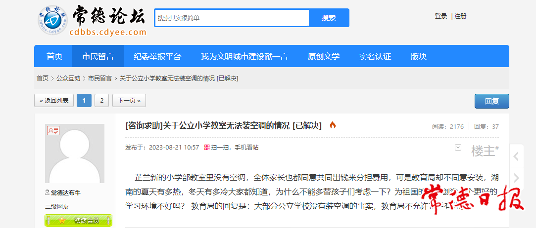 市民在常德论坛发帖询问教室装空调事宜