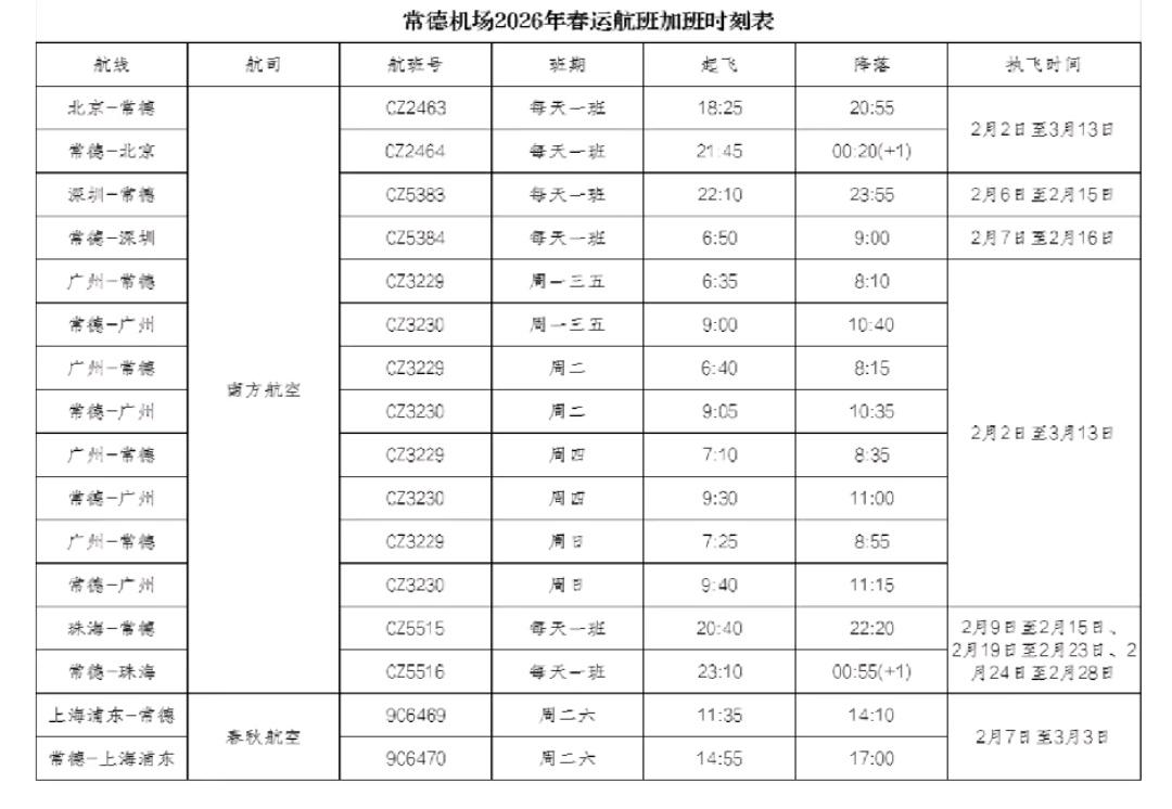 据悉,预计2026年春运期间,桃花源机场共计加密航班230架次。目前以上加班航班机票已在航空公司官方网站开售,具体信息以航空公司实际售票为准。冬季天气复杂多变,机场温馨提示广大旅客:请及时关注航班动态,合理安排出行。
