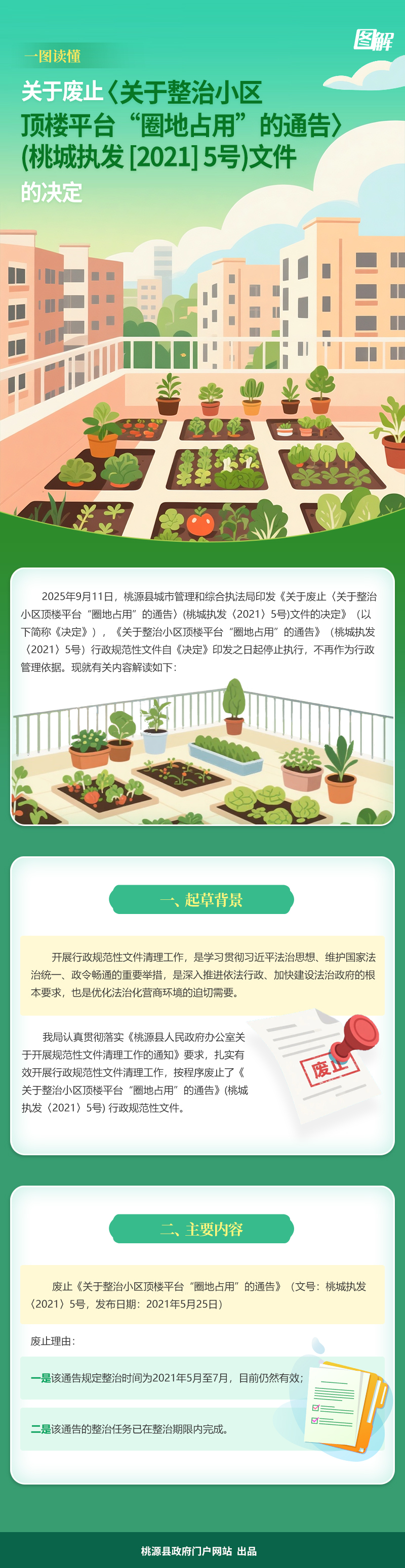 图文解读:桃源县城市管理和综合执法局关于废止《关于整治小区顶楼平台“圈地占用”的通告》(桃城执发【2021】5号)文件的决定